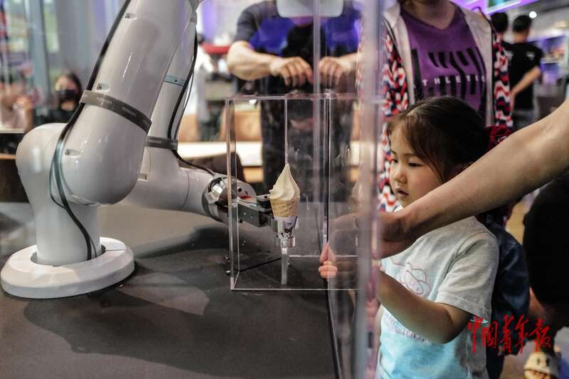 4月19日, 北京经济技术开发区,智能机器人主题2.0餐厅,机器人在制作冰淇淋。除此外餐厅还配备了爆米花机器人,咖啡、奶茶、调酒三合一机器人覆盖从主食到甜点、从软饮到酒品等品类。据中国电子信息产业发展研究院发布的《2026年未来产业十大赛道》显示,全球具身智能市场规模未来五年复合增长率达73%,预计2030年将达到2388亿元。另据工信部数据,2025年国内人形机器人整机企业数量超140家,发布人形机器人产品超330款。中青报·中青网记者 赵迪/摄