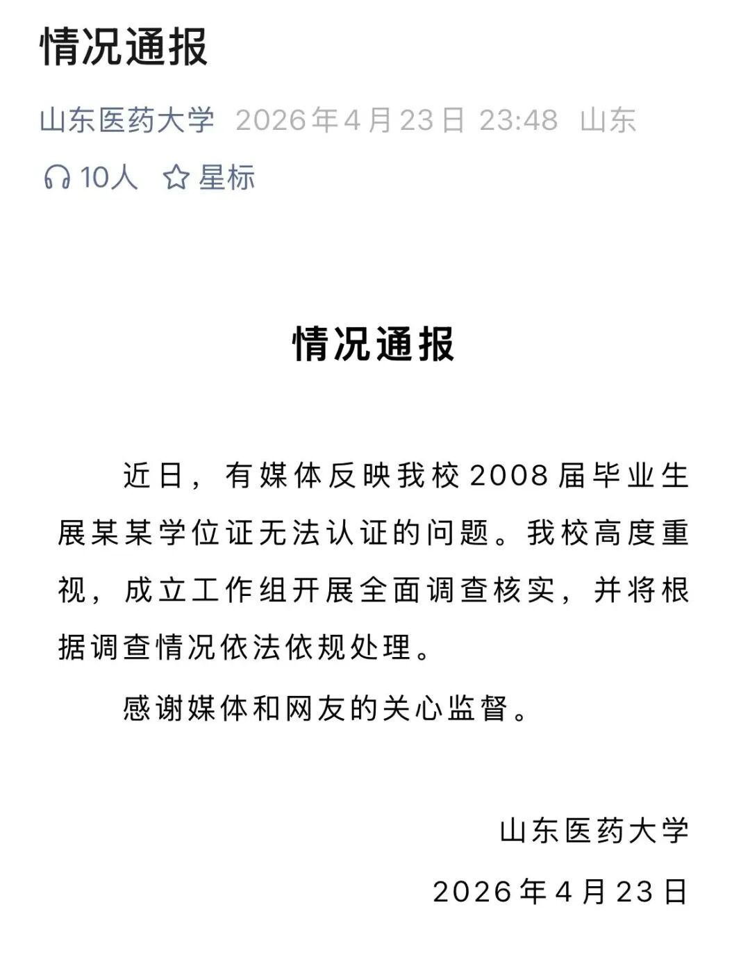 4月23日,山东医药大学发布情况通报,表示“近日有媒体反映我校2008届毕业生展某某学位证无法认证的问题。我校高度重视,成立工作组开展全面调查核实,并将根据调查情况依法依规处理。”
