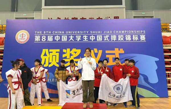 从大一刚入校时体测勉强达标、基础摔投动作都难以完成的“脆皮大学生”,到大三时斩获中国大学生太极推手锦标赛甲A组女生52公斤级项目冠军,再到中国大学生中国式摔跤锦标赛甲A组女生48公斤级项目亚军,安徽省蚌埠医科大学公共卫生学院2023级食品卫生与营养学专业学生赵静茹,对“健康第一”有了切身的体会。