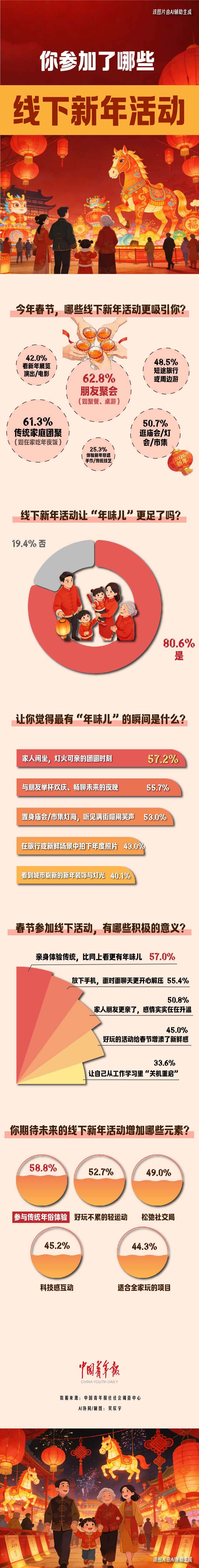春节期间,丰富的线下新年活动让年味儿更浓。近日,中国青年报社社会调查中心联合问卷网(wenjuan.com)进行的一项有1333名受访者参与的调查显示,朋友聚会(62.8%)、传统家庭团聚(61.3%)、逛庙会/灯会/市集(50.7%)是最吸引受访者的三类新年线下活动,超八成(80.6%)受访者认为线下新年活动让年味儿更足。57.0%的受访者认为线下新年活动的意义在于可以亲身体验传统习俗,比网上看更有年味儿。58.8%的受访者期待未来春节线下活动有更多传统年俗体验。