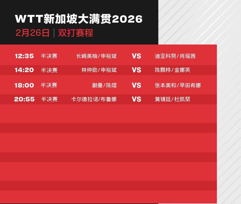 2026年WTT新加坡大满贯精彩继续,经过4个正赛日的争夺,孙颖莎、王曼昱、王楚钦等11名国乒选手晋级单打16强。26日将进行男女单打1/8决赛及双打半决赛,其中将上演3场“中日对决”,具体赛程如下: