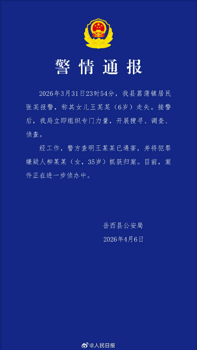近日,安徽省安庆市岳西县菖蒲镇一6岁女童失联。4月6日晚,当地发布通报称,该女童已遇害,犯罪嫌疑人柳某某已被警方抓获归案。