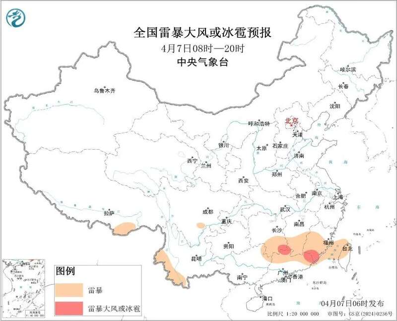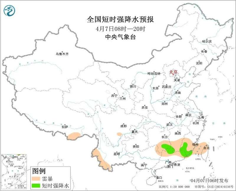 据中央气象台,预计4月7日08时至8日08时,重庆北部、湖北西北部、湖南东南部、江西南部、福建南部、云南西南部、广东东北部、台湾岛西北部等地的部分地区将有短时强降水天气,小时雨量20-40毫米,局地可达50毫米以上;另外,湖南东南部、江西南部、福建南部、云南西南部、广东东北部等地的局地将有雷暴大风或冰雹天气。