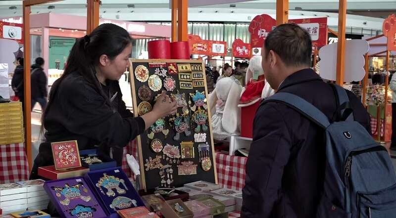 2月6日,“归兴肆见”新春市集上,售货员向旅客介绍冰箱贴。中青在线记者 郭艳丽/摄