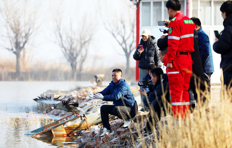2月2日,世界湿地日,衡水湖畔。一只曾被困于冰面、奄奄一息的灰雁,在众人注视下重返蓝天。
