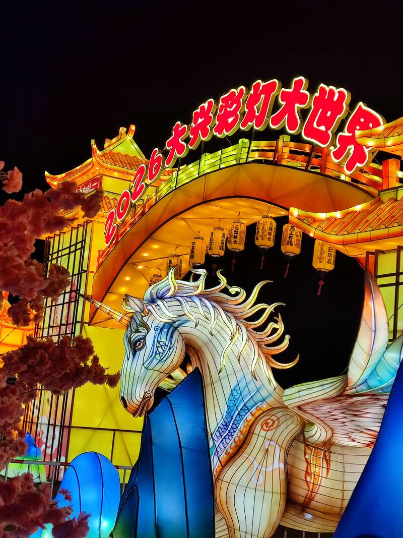 2月9日,北京大兴彩灯大世界南门入口流光溢彩,“神马”傲首展翅,与背景中“2026大兴彩灯大世界”璀璨的牌匾交相辉映。中青在线记者 杨海琴/摄
