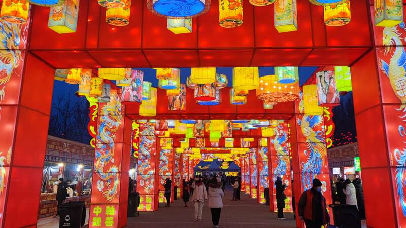 2月9日,北京大兴彩灯大世界,融合非遗剪纸与龙凤纹样的红色灯廊璀璨夺目。市民穿梭其中,感受丙午马年的新春气息。中青在线记者 杨海琴/摄