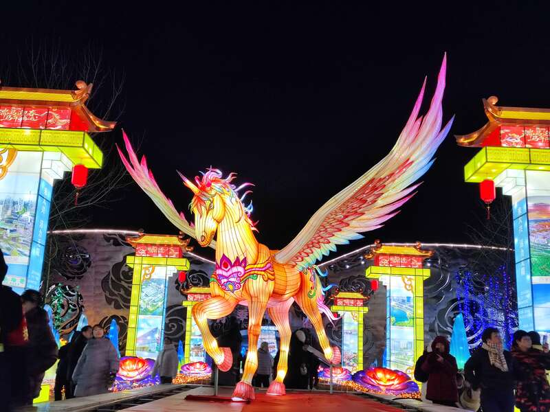2月9日,北京大兴彩灯大世界,寓意着“马到成功、展翅高飞”的巨型翼马彩灯,吸引游客驻足观赏。 中青在线记者 杨海琴/摄