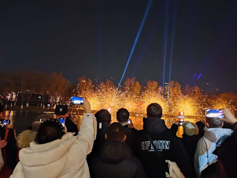 2月9日,北京大兴彩灯大世界,国家级非物质文化遗产“打铁花”精彩上演,游客们纷纷举起手机拍摄记录。中青在线记者 杨海琴/摄