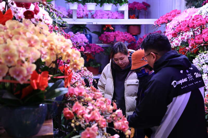 2026年2月10日,临近春节,北京鲜花市场供销两旺。图为北京海淀区西三旗花市里顾客正在选购鲜花。(中青在线记者 于璧嘉/摄)