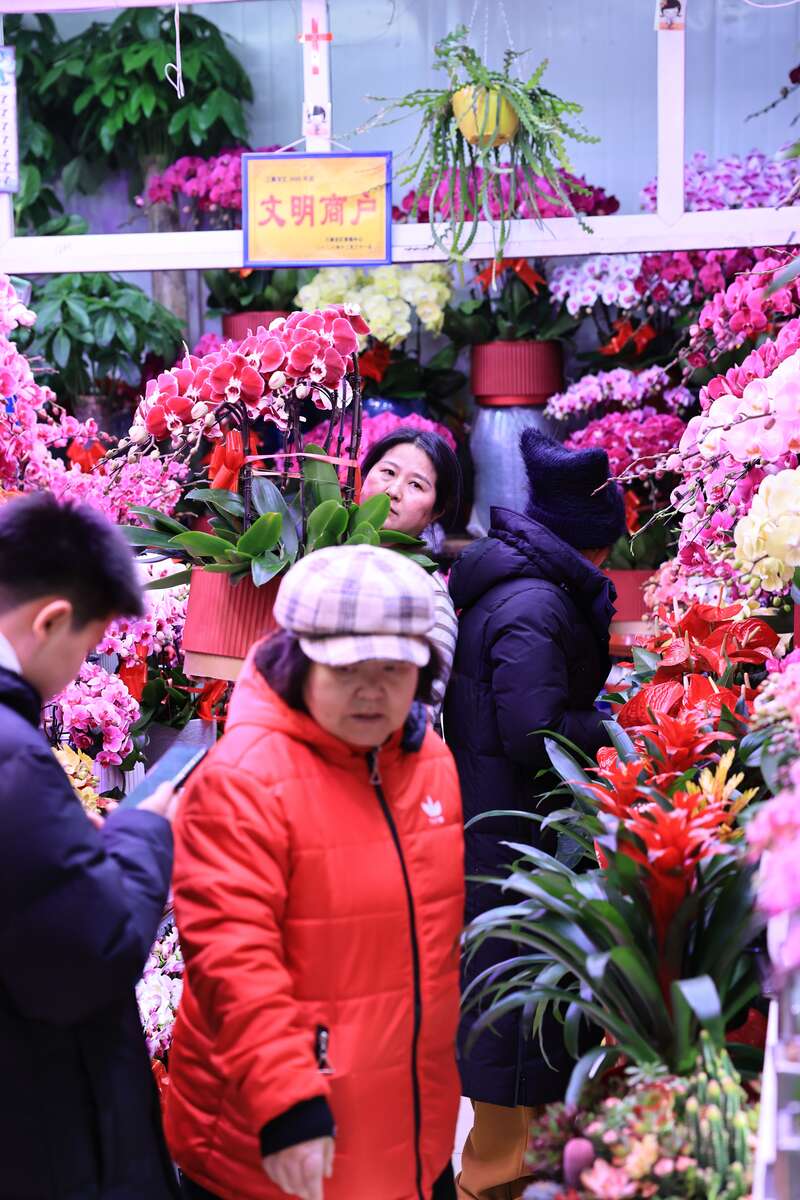 众多花卉中,富有美好寓意的品种尤其受欢迎。在花商刘女士的摊位上,各色兜兰开得正盛。“每天能卖出几十盆,比月初翻了几番。”她笑着说,“很多顾客冲着‘兜住福气’的好彩头来买,每年春节前都是这样。”