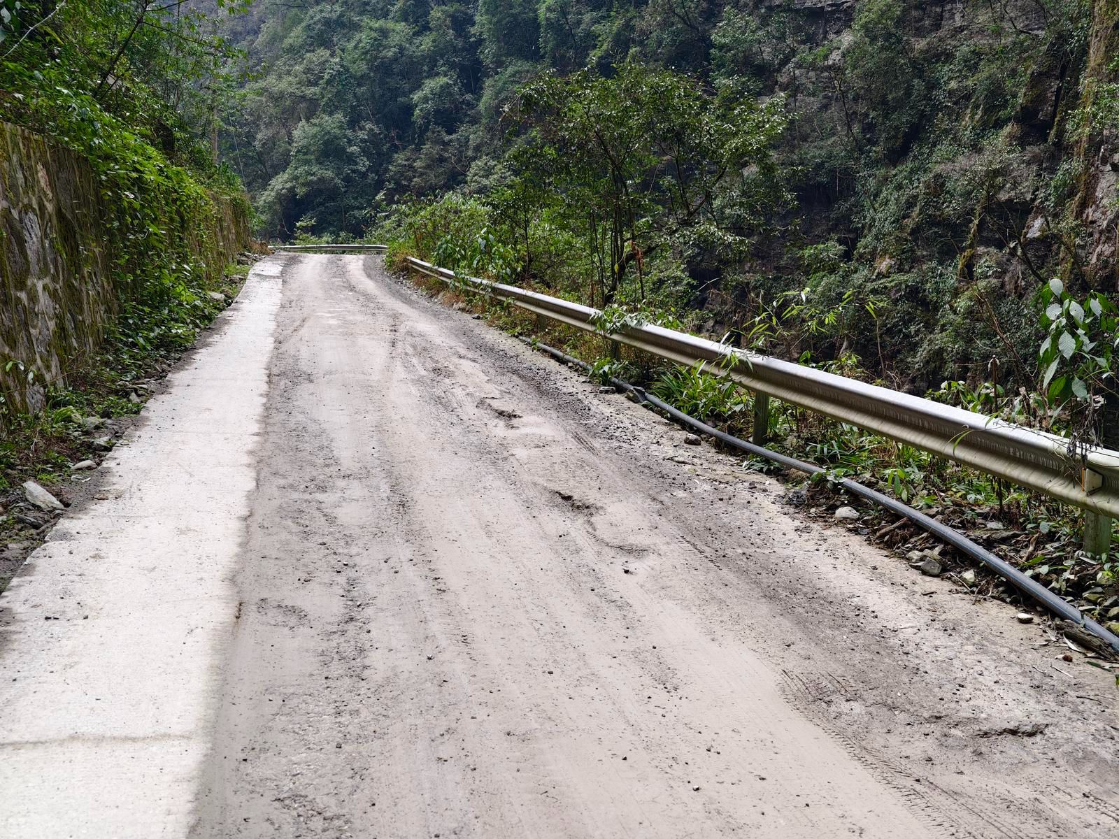 穿过山涧,八大公山镇的镇长唐运平正和同事向姝巡查路面,脚下的河床里还能看见碎石。这里曾是618暴雨的重灾区,河道两岸的护堤是灾后重建的,桥侧的水泥面上还能看到洪水漫过的痕迹。