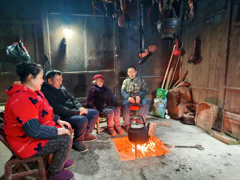 五道水镇的王秀章家里,木屋内已是暖意融融,四世同堂的团圆饭正紧锣密鼓筹备着。老人围坐在火塘边,火光映着满脸笑意,火塘上悬着的腊肉滴着油,香气溢满全屋;小孙子抡着小木槌,正专心致志地在石臼里打糍粑,糯米团在槌下翻滚,黏软的香气混着柴火味,满是年的滋味。