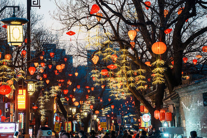 当我抵达令人又熟悉、又陌生的“模式口历史文化街区”时,天色已经暗了下来。街口一排灯笼亮起,烘托出暖洋洋的年味。顺着人流往里走,街道两侧是修缮一新的院落和门脸,灯光映着青砖灰瓦,既有节日的热闹,也保留了老房子的厚重感。年轻人举着手机取景,孩子追着发光装置跑,老人慢慢走在一旁,组成了一幅充满活力的节庆画卷。