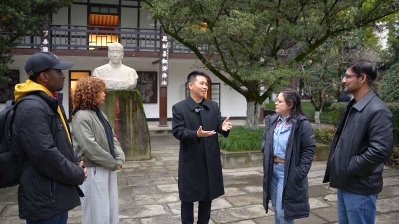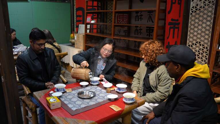 4名外籍友人参观了李劼人故居纪念馆,了解了李劼人的生平事迹以及成都的市井文化,并体验了盖碗茶、成都糖画、灯会等非遗民俗。